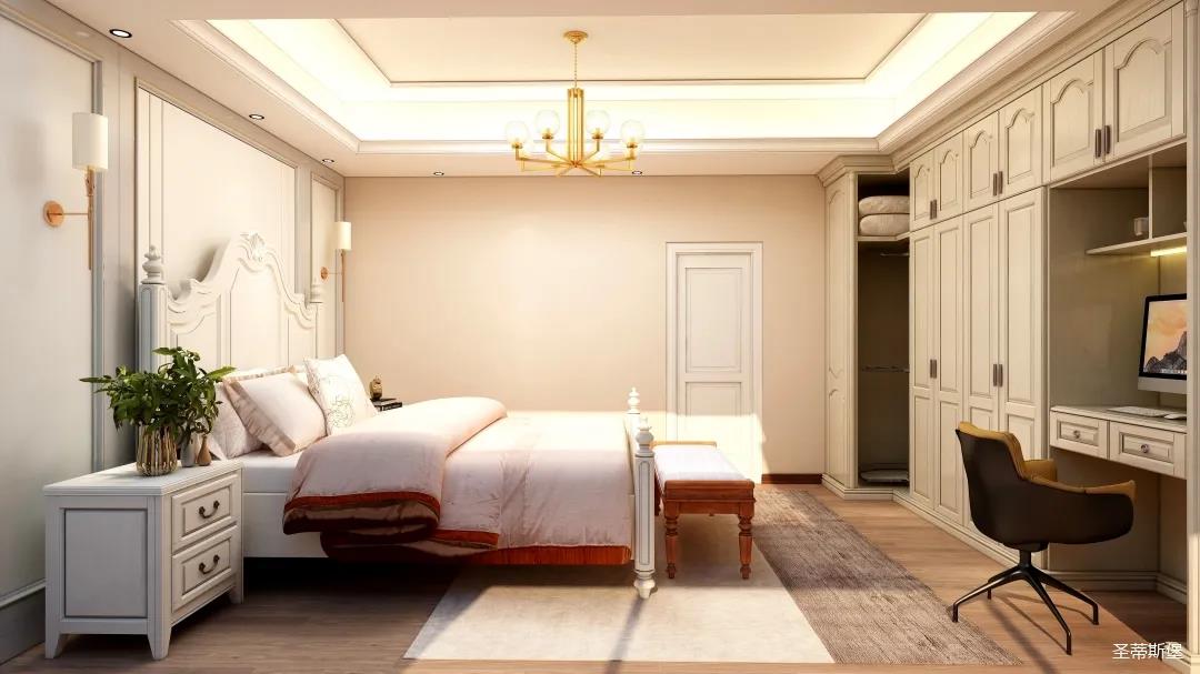 次臥的設(shè)計(jì)更注重收納,人性化嵌入式書桌,整排衣柜設(shè)計(jì)有效的利用了空間每一個(gè)角落。床屏在保持原有美式家具特色的同時(shí),增加了線條美,將繁雜的雕琢簡(jiǎn)化,并融入時(shí)尚的美式元素,壁燈,吊燈糅合自然光影,完美呈現(xiàn)出尊貴的空間格調(diào)。