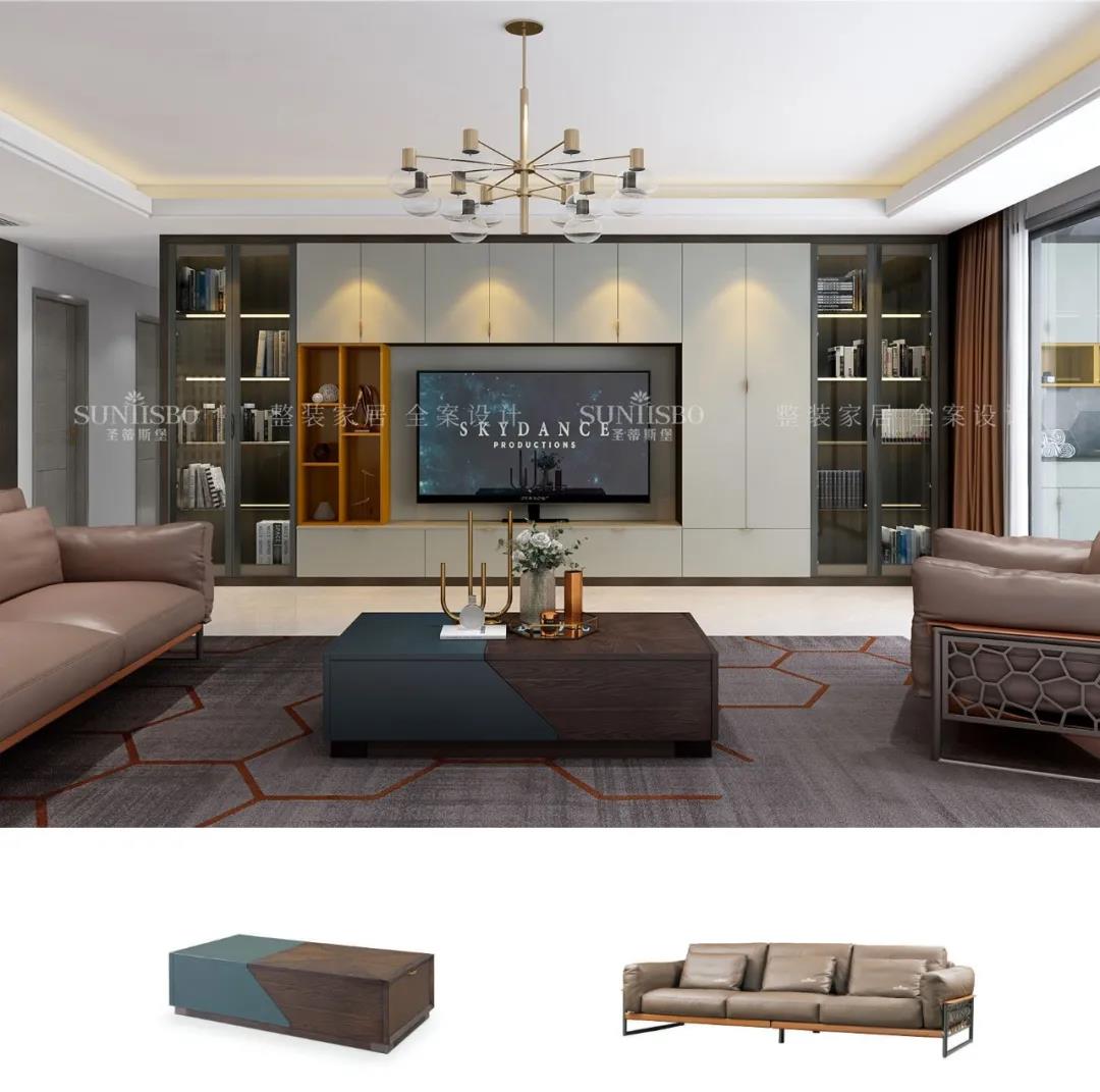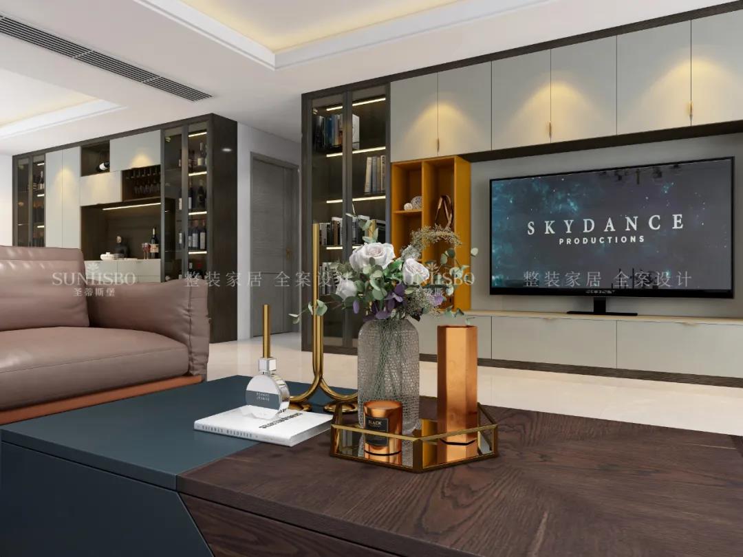客廳一面置頂?shù)亩ㄖ乒瘢蟠笤黾恿丝臻g收納,也將電視背景墻的觀賞性發(fā)揮到極致。淺灰與明亮橙的“動(dòng)靜”屬性,與沙發(fā)上的愛(ài)馬仕橙相呼應(yīng),從空間中漫溢出歡樂(lè)和跳動(dòng)的樂(lè)章,回響生活中那一抹絢麗和精致,同時(shí)也擁有著對(duì)立且和諧的高級(jí)范兒。