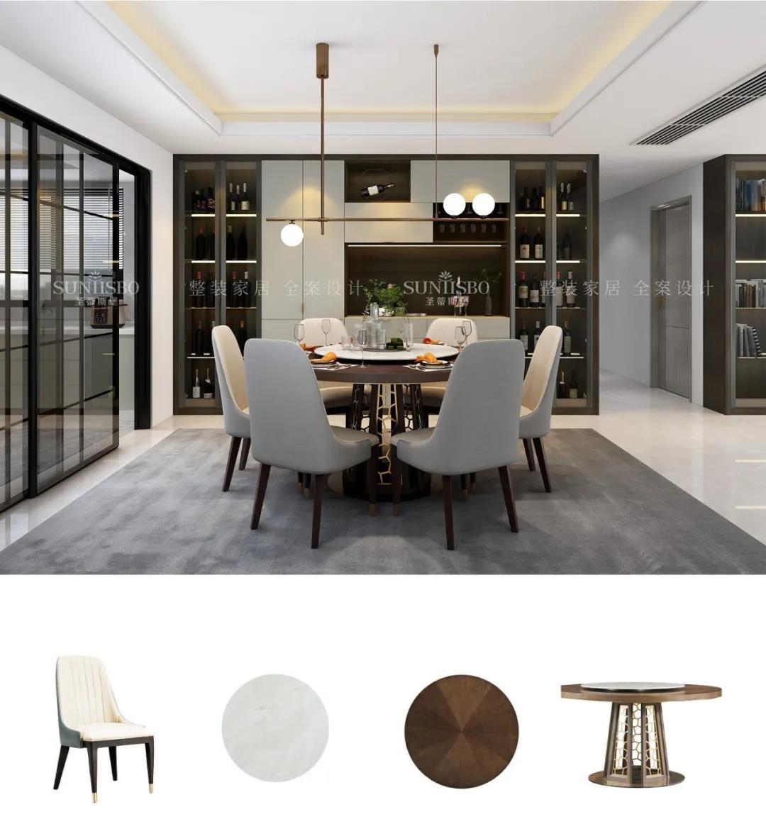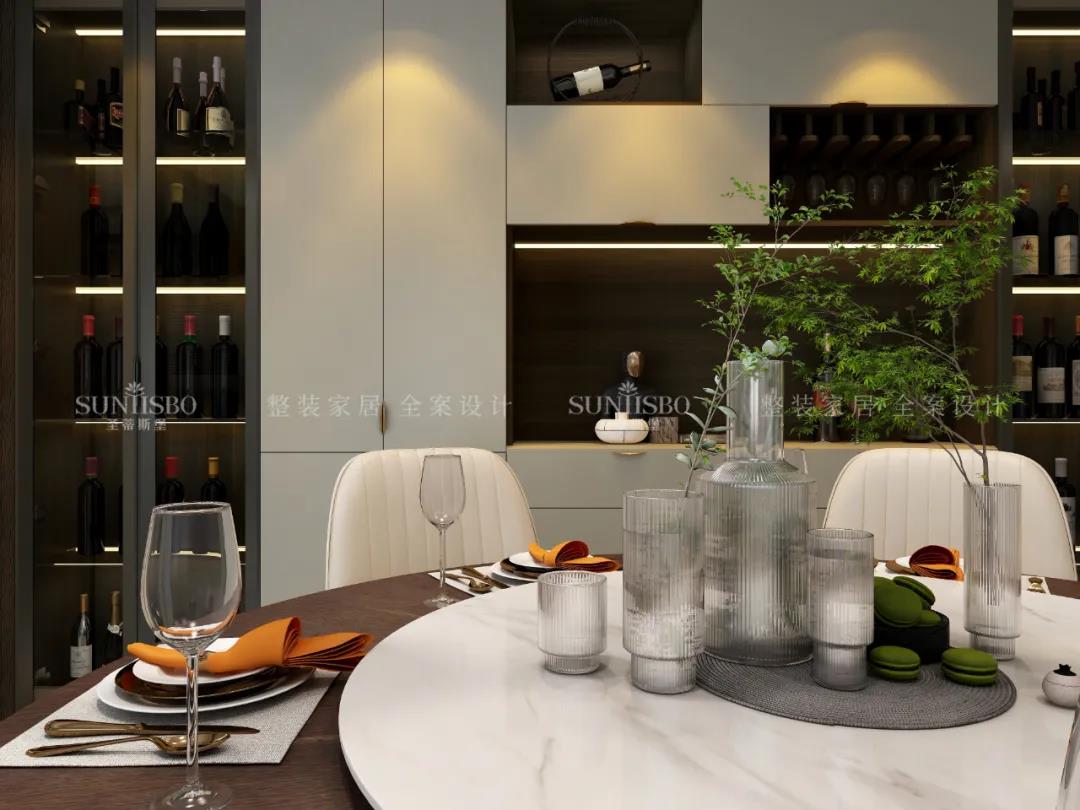 移步到餐廳空間,餐邊柜立面簡(jiǎn)致,紋理細(xì)膩,展示區(qū)合理分配,增強(qiáng)了空間層次感,彰顯出飽滿的意式美感。實(shí)木柜面加以金屬拉手的裝飾,將極簡(jiǎn)現(xiàn)代與高端質(zhì)感融合,以簡(jiǎn)約的形式表達(dá)出“簡(jiǎn)而不失其華”的感染力。