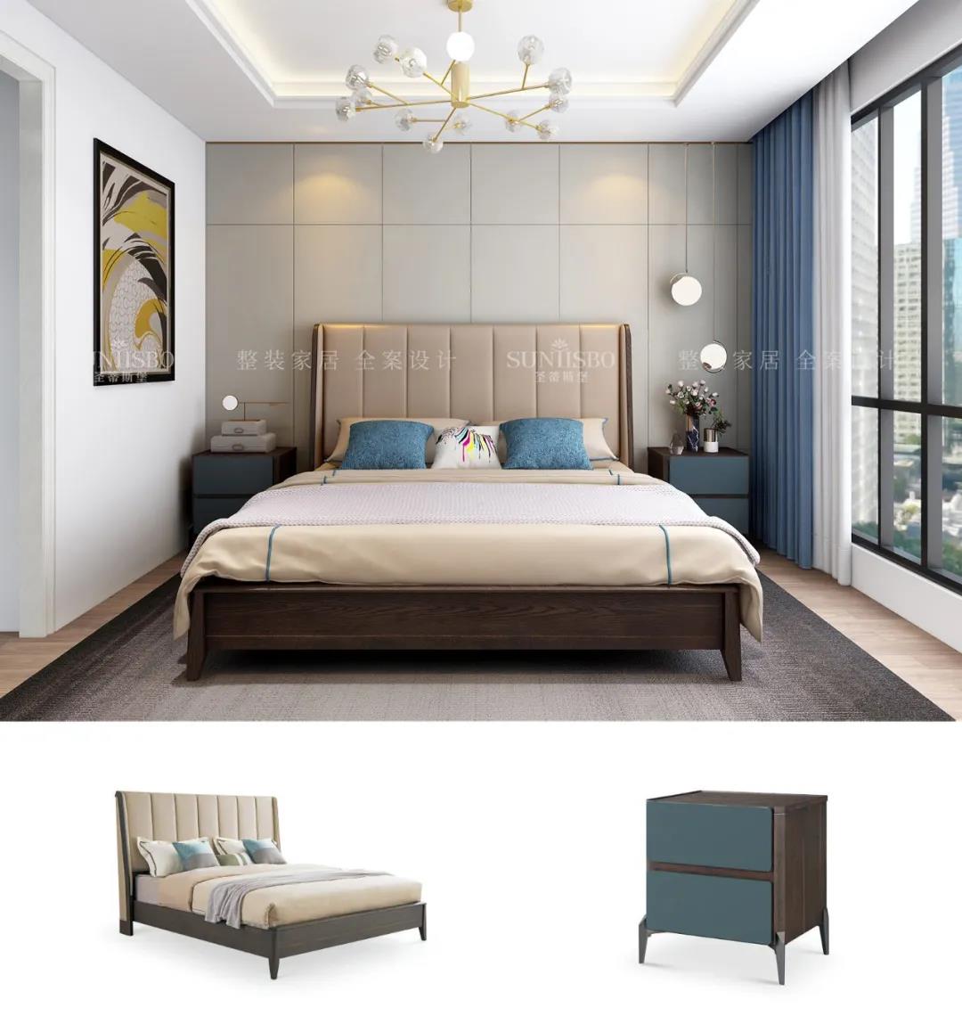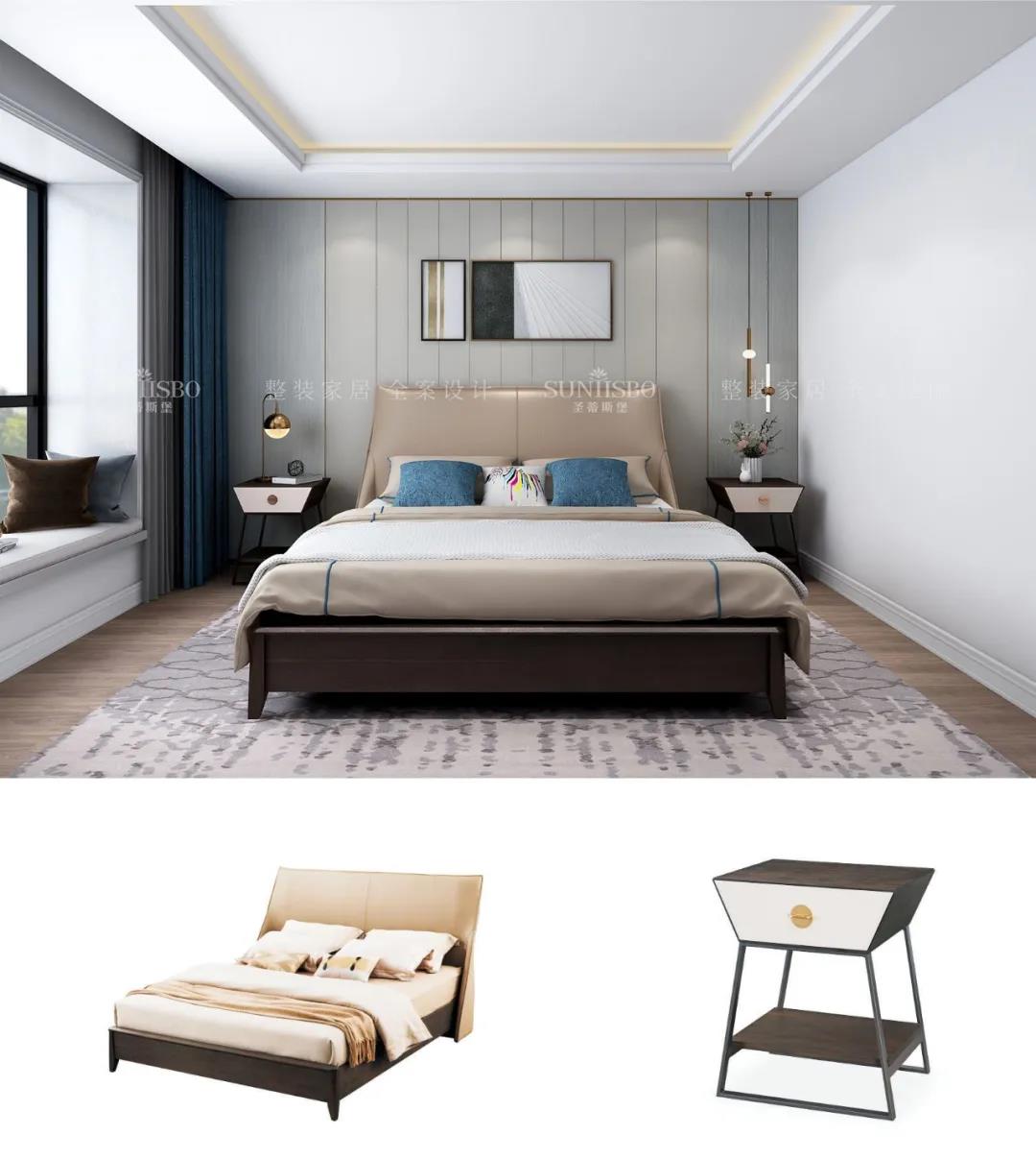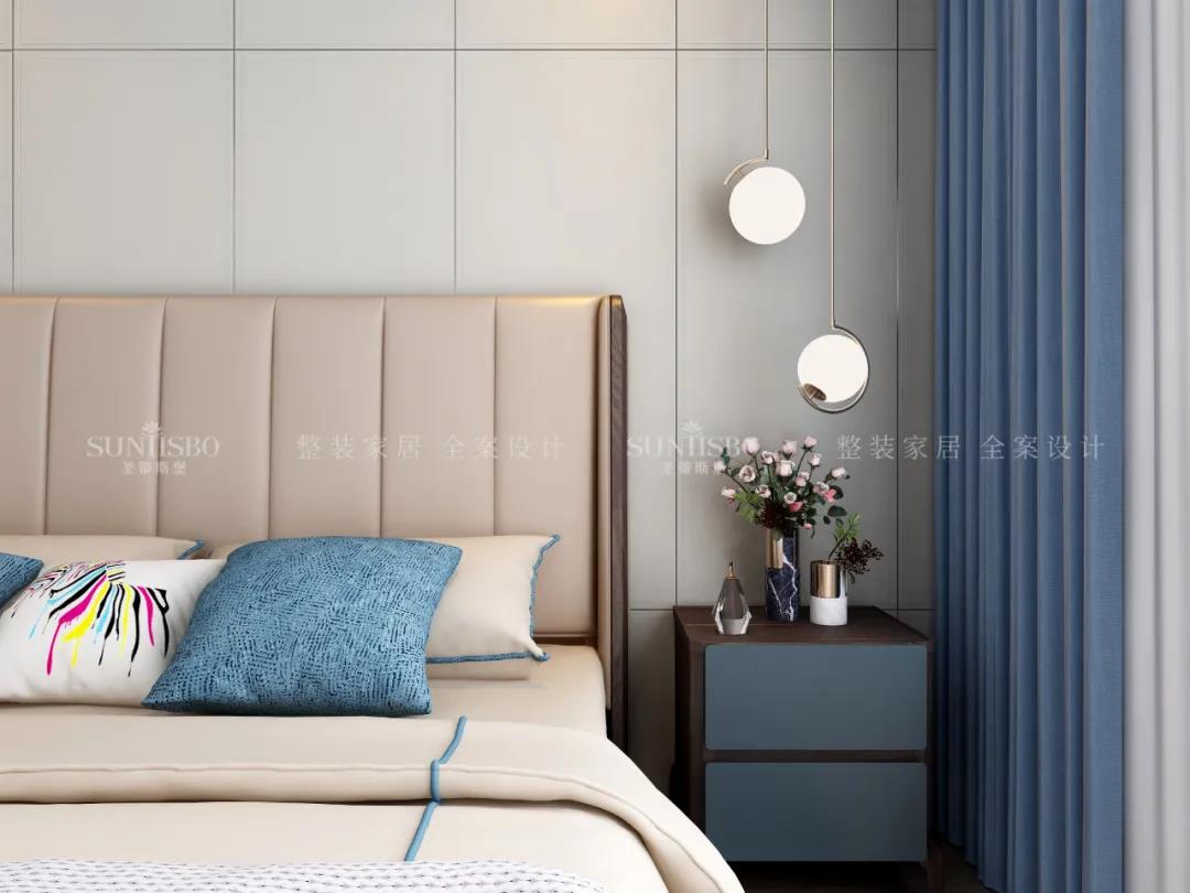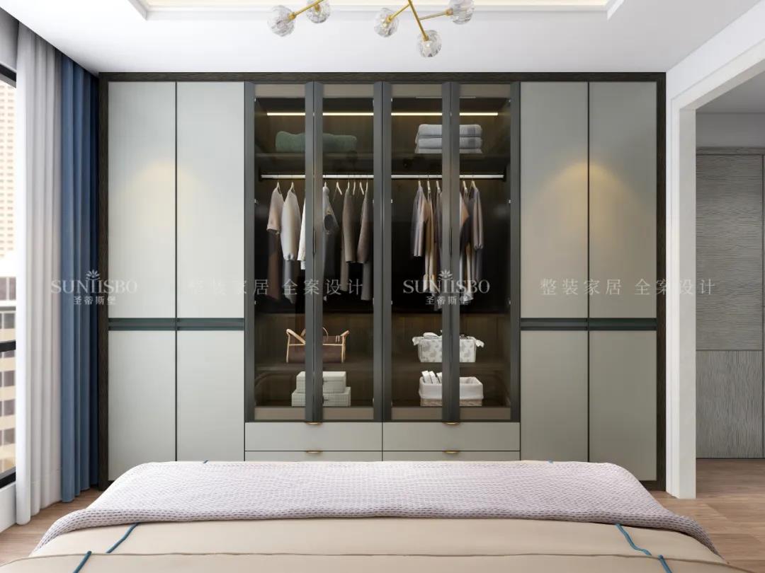 設(shè)計(jì)師運(yùn)用最為百搭淺灰實(shí)木護(hù)墻板打造主臥空間,簡(jiǎn)約的線條縱橫交錯(cuò),帶來(lái)了干凈、清爽、舒適的視覺(jué)效果。明暗分區(qū)的衣柜在燈光的渲染下,虛實(shí)光影變換其中,為每個(gè)角落氤氳出浪漫的氣息。