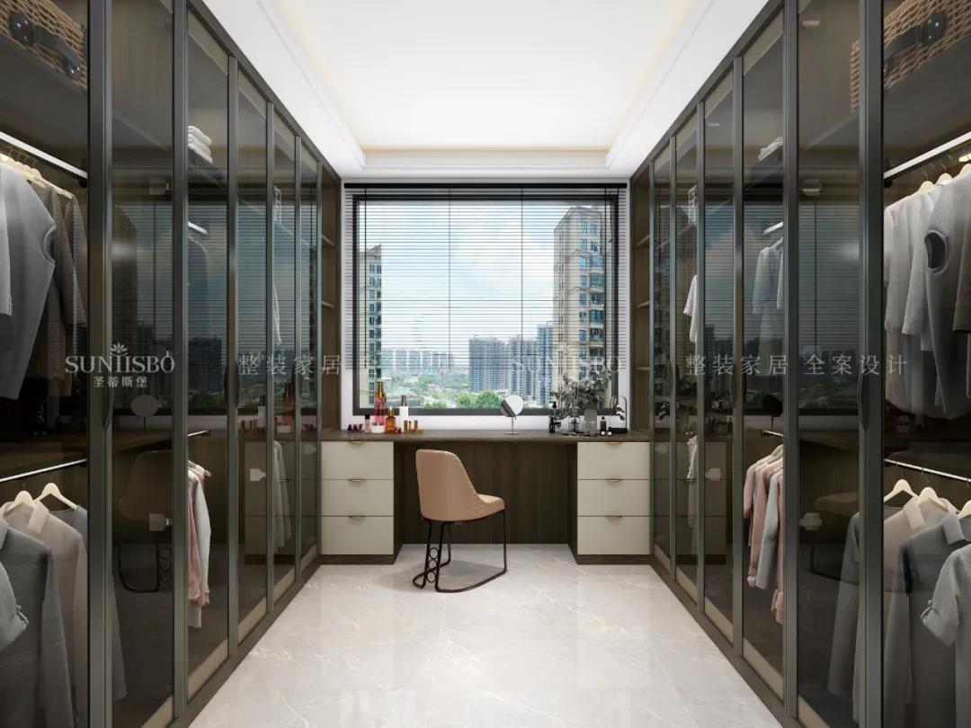 家的質(zhì)感,并不是用瑣碎的東西堆砌而成的,衣帽間是品質(zhì)生活的一個(gè)重要的指標(biāo)。這套衣帽間是以平行的格局設(shè)計(jì)成步入式空間,全開放式的呈現(xiàn),金屬與透明玻璃材質(zhì)的糅合,襯托出柜體高級(jí)奢華的質(zhì)感。