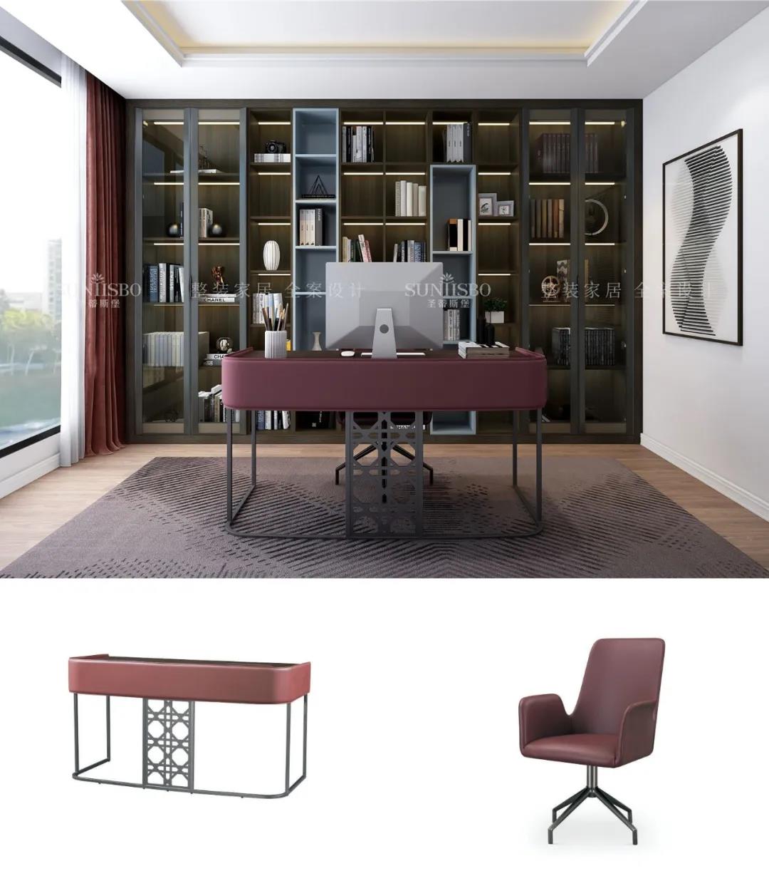 書房用定制柜解決了一面墻的設(shè)計(jì),沒(méi)有夸張的色彩裝飾,簡(jiǎn)潔的柜體與墻面搭配起來(lái)顯得十分精致整潔,透明的可視區(qū)域從視覺(jué)上擴(kuò)大了空間感。閑暇時(shí)光,拾一本書,于書房,將生活與工作區(qū)分開來(lái)。