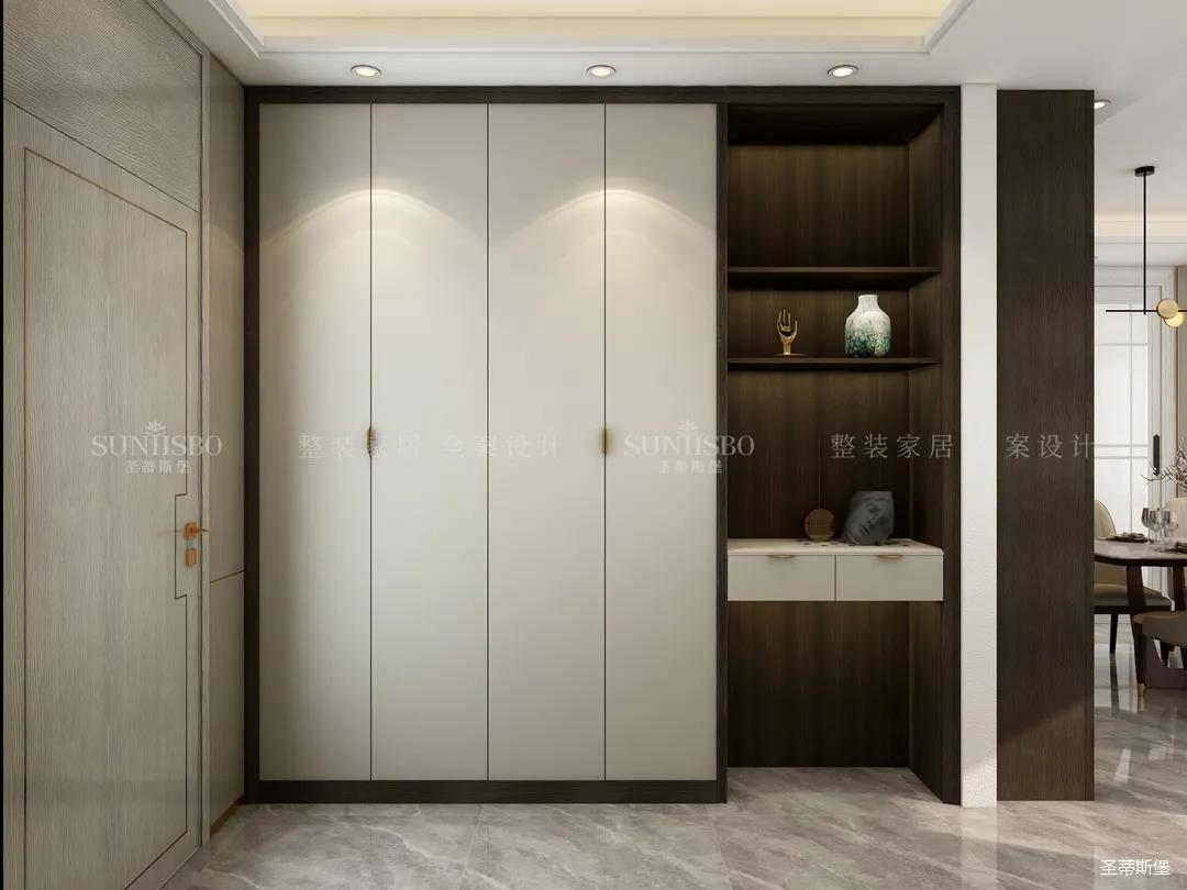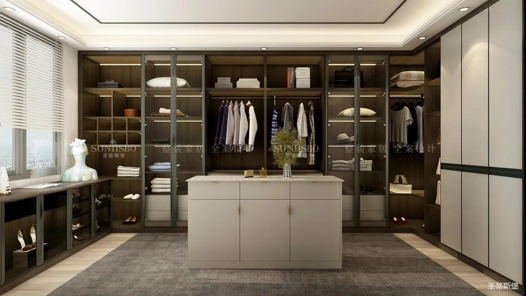 衣帽間采用了虛實結(jié)合的設(shè)計,構(gòu)筑起規(guī)整而有序的置物區(qū)域和功能齊全的收納系統(tǒng),煙熏色實木作為空間的主要元素,環(huán)抱著整個衣帽間,張揚又不失沉穩(wěn),恰到好處地搭配金屬玻璃置頂高門和感應燈光系統(tǒng),挑高了空間效果,也詮釋著現(xiàn)代極簡線條美感和對極致的生活追求。