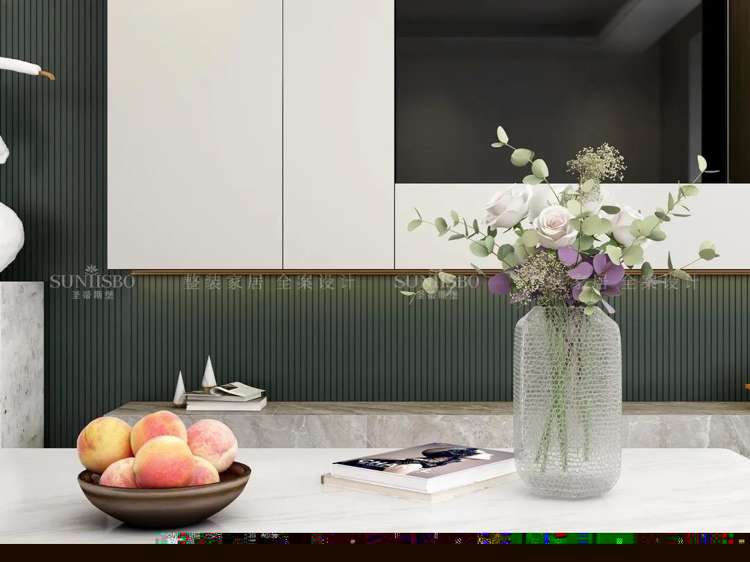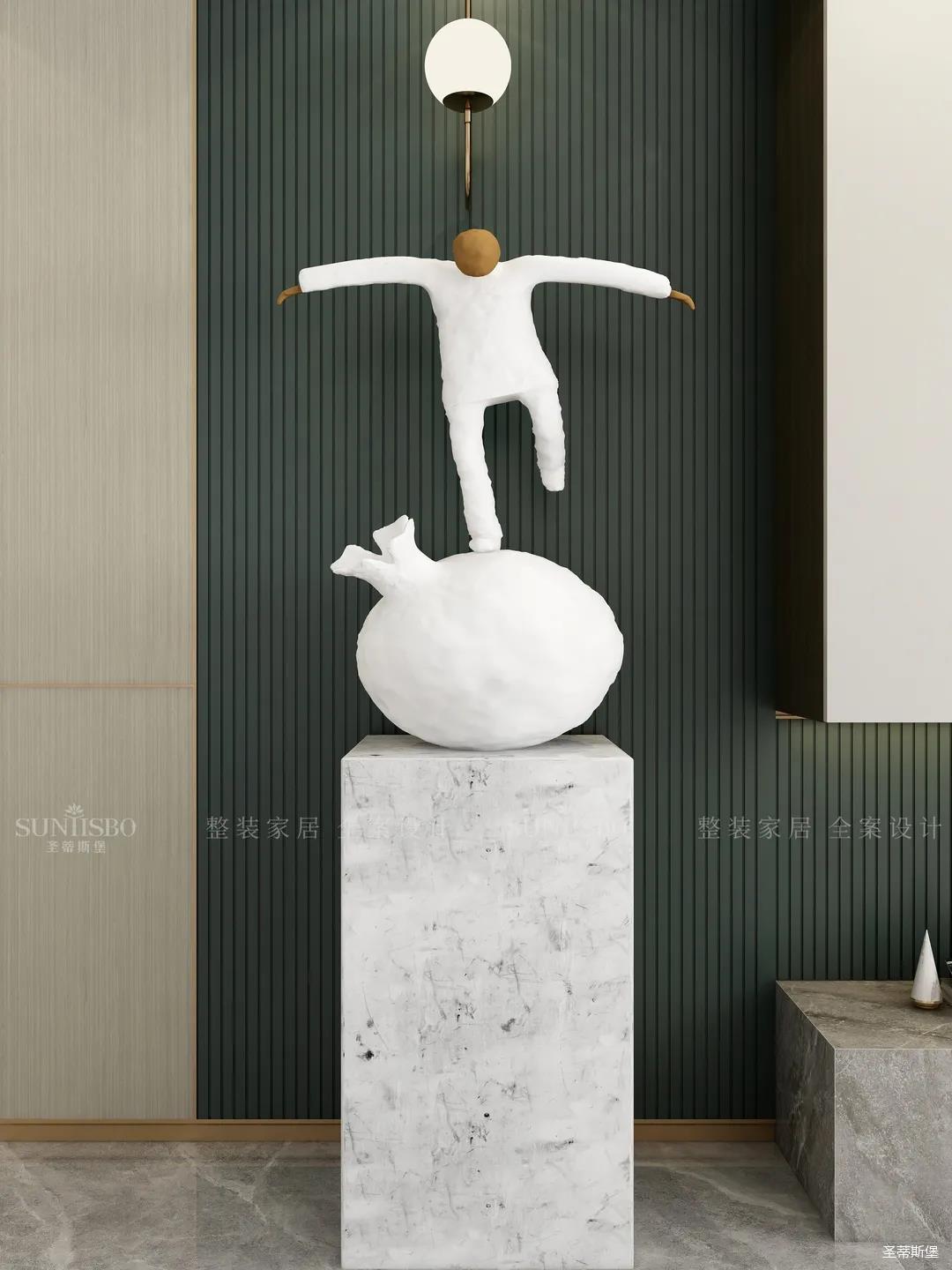 白綠搭配作為當下時尚界的黑馬,一個沉著冷靜,一個高級清新,相互碰撞出前所未有的視覺享受。純白異型藝術(shù)雕塑是室內(nèi)和諧的體現(xiàn),也讓空間洋溢著趣味性。