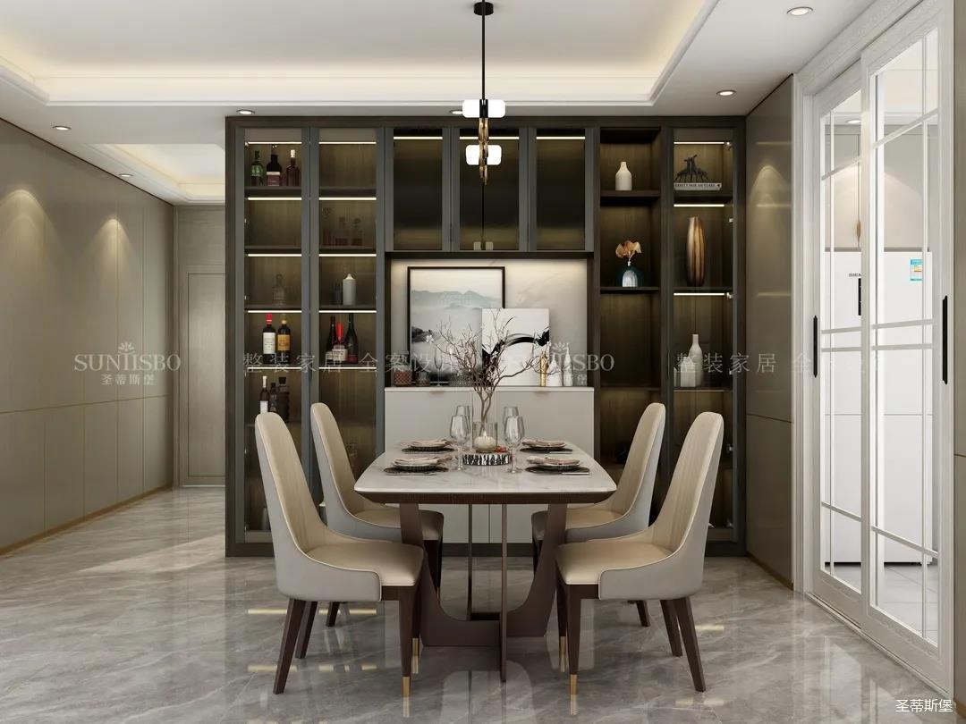 餐廳全開放式的布局,遵循了家具收納的28原則,20%的封閉式儲納,收納不常用的雜亂物品,80%的半開放設(shè)計,展示軟裝飾物。餐邊柜將玻璃、金屬、實木材質(zhì)糅合分配,讓空間質(zhì)感倍增的同時,也讓用餐空間多了一份家的溫度。