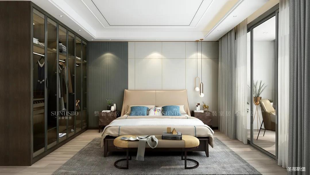 主臥運用了大面積落地窗圍合,整體的無主燈設(shè)計,凸顯了空間極簡潮流。無限引入窗外的移動光線,輕松為空間注入陽光的溫度,u型極簡金屬懸置著一個白色造型燈,讓空間從靜謐中生出無窮的變幻。家具設(shè)計偏向簡約舒適,造型雖不奪目,但細節(jié)質(zhì)感卻能經(jīng)得起時光的琢磨與品味。