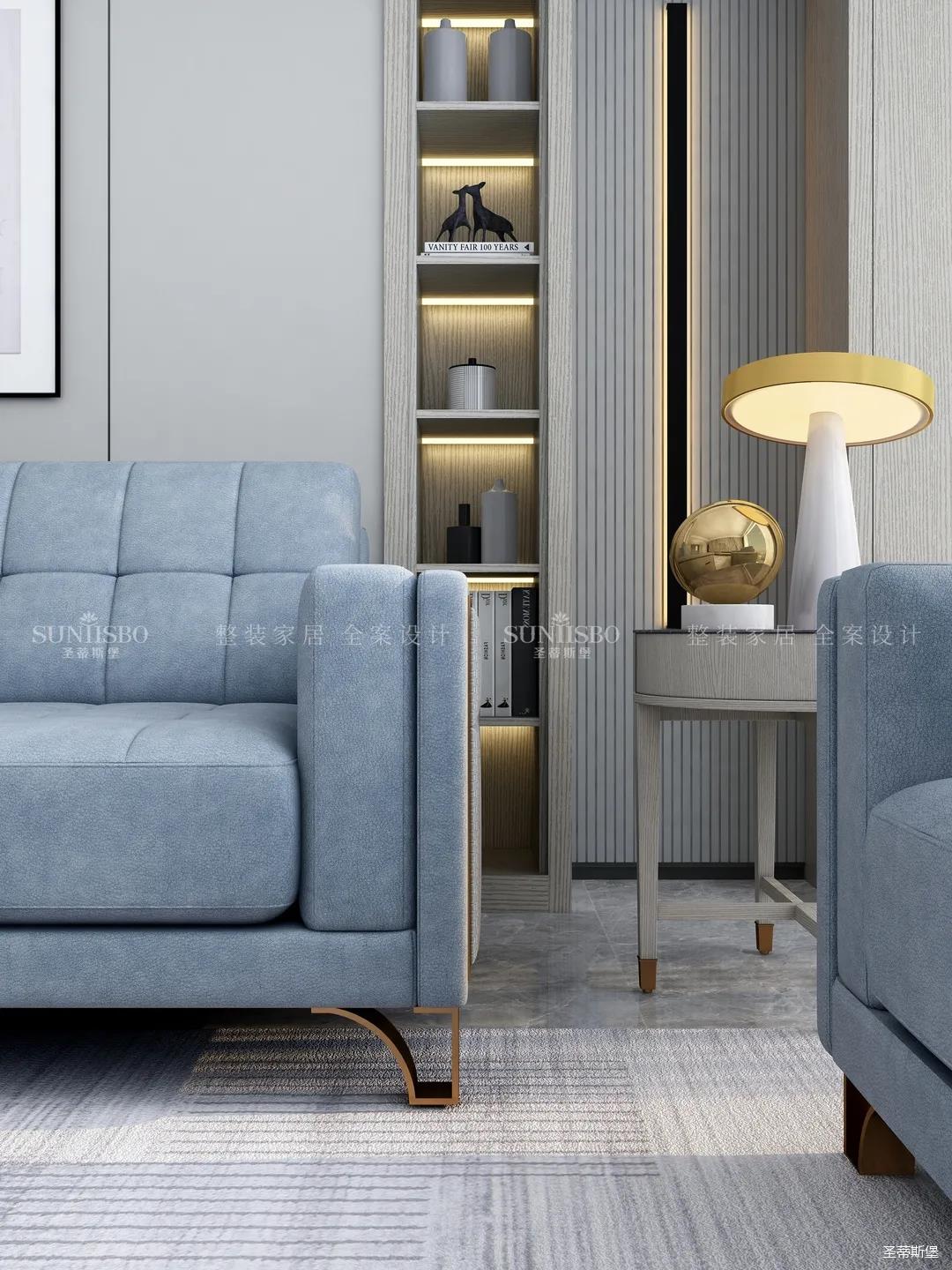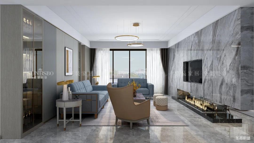 精細(xì)結(jié)構(gòu)下沙發(fā)角幾的微金屬結(jié)構(gòu),干凈利落,彰顯質(zhì)感。整面大理石背景墻將電視設(shè)計(jì)為壁龕結(jié)構(gòu),底部的裝飾壁爐讓家的溫馨感再度升級(jí)。