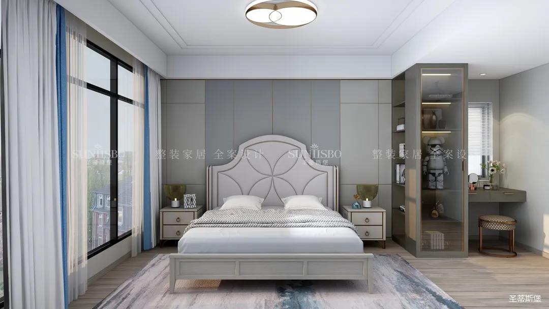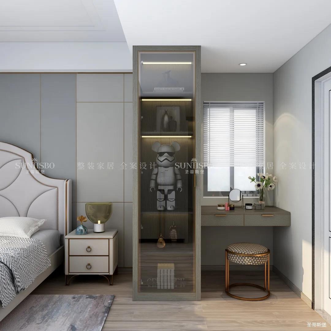 主臥的設(shè)計(jì),整體風(fēng)格與色調(diào)的一致,通過空間設(shè)計(jì)與軟裝細(xì)節(jié)的調(diào)控,顯得主臥多了一份寧靜與放松。四照花床屏的細(xì)節(jié)、材質(zhì)色彩的把握、隔斷小書桌的設(shè)計(jì),無不體現(xiàn)著設(shè)計(jì)師獨(dú)特的品位和全案設(shè)計(jì)的能力。