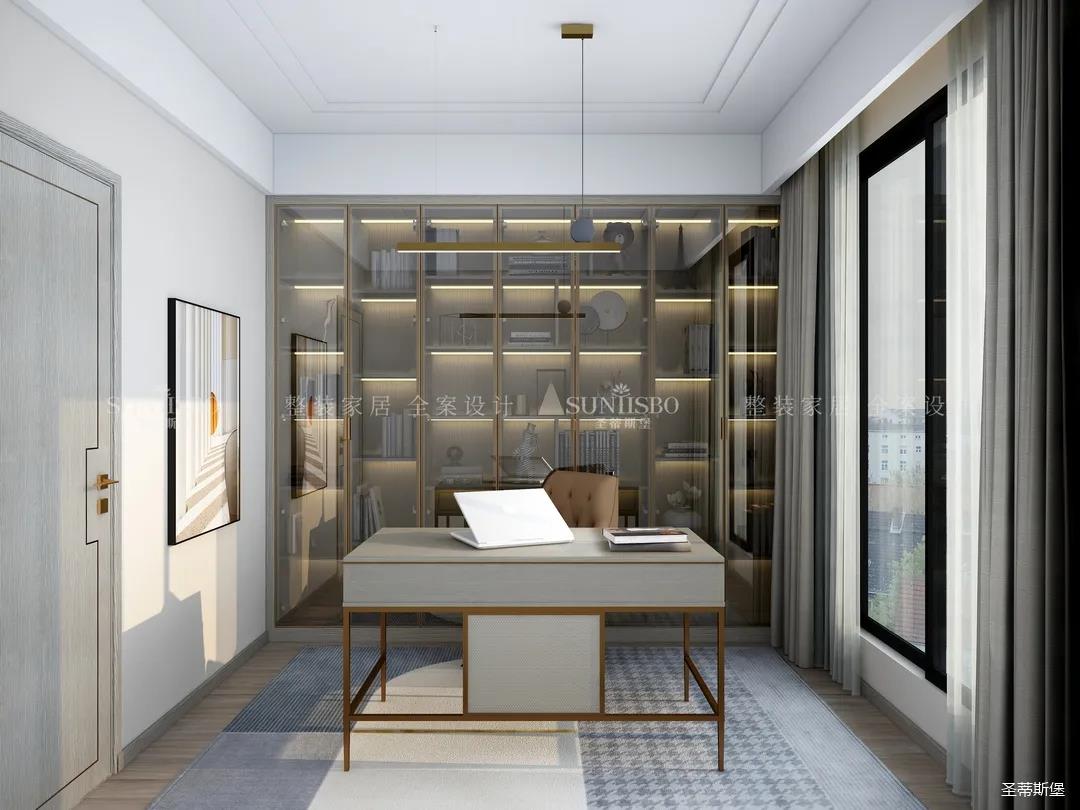 書房在陽光下襯得通透自然,半透明的灰玻利用高級(jí)且親和的色彩貫穿著柜體與空間的互動(dòng),溫潤的木質(zhì)、輕奢的金屬以拼合的狀態(tài),將屋主感性與時(shí)尚的生活理念滲透進(jìn)書房空間。不同材質(zhì)的搭配為空間增添平衡感,使得緊繃的工作狀態(tài)得到放松。