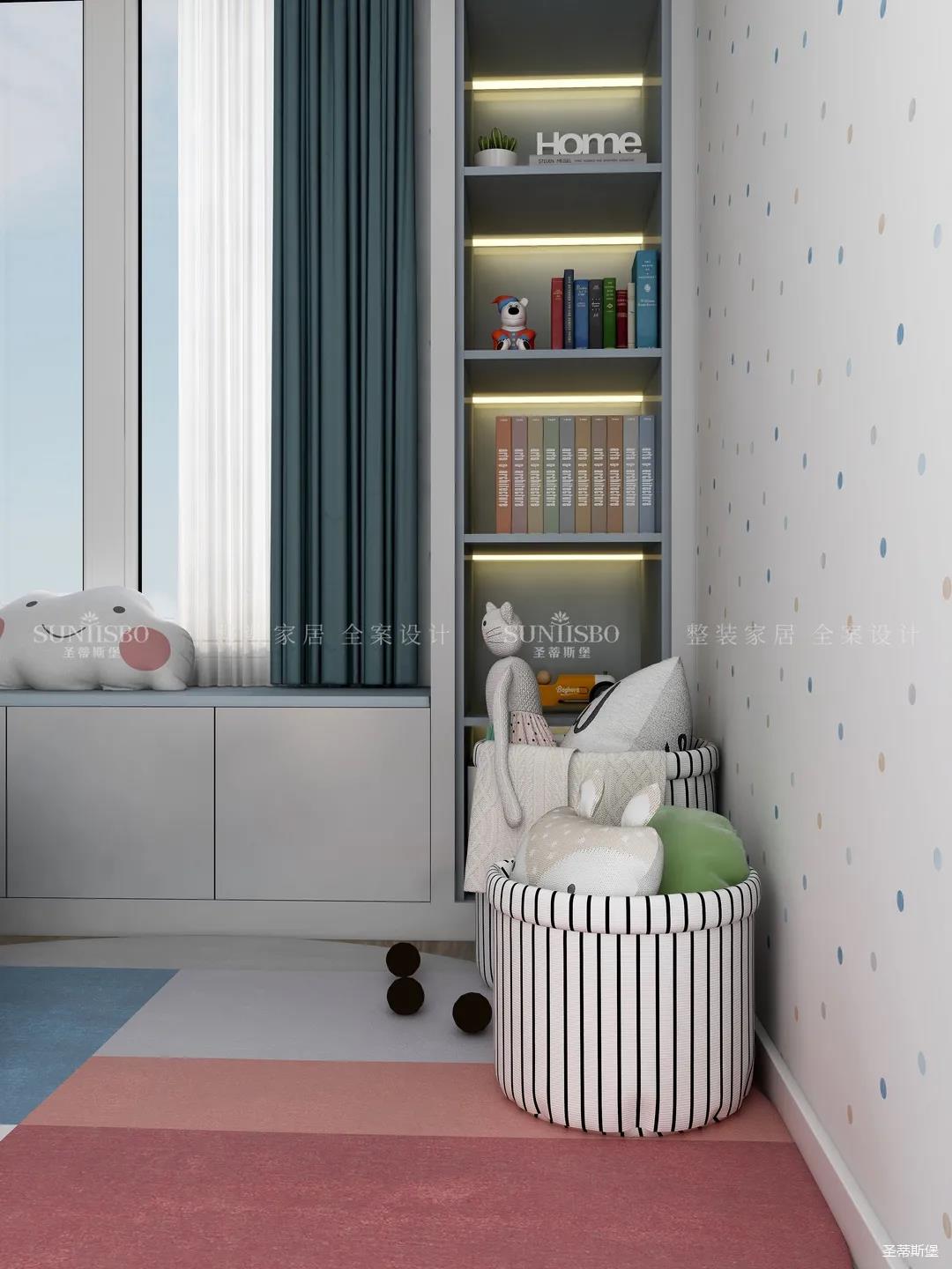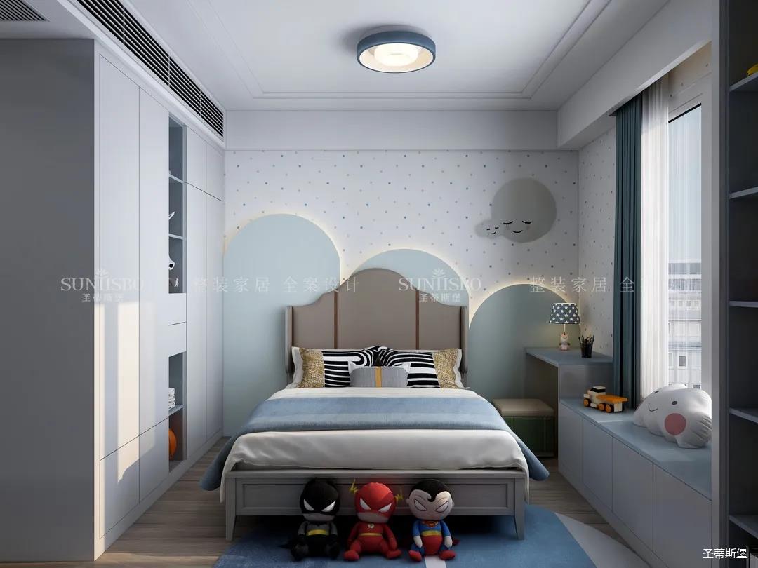 兒童房追求的是童真與自然,柜體的色彩與軟裝搭配完美呼應(yīng),云朵山峰的背景墻,以特立獨(dú)行的設(shè)計(jì)在視覺上讓心靈得到放空的意境。沿窗打造的飄窗格局,增加空間的功能性,造型簡約的柜體根據(jù)家裝理念摒棄了繁復(fù)的設(shè)計(jì),更多展現(xiàn)的是空間自然之美。