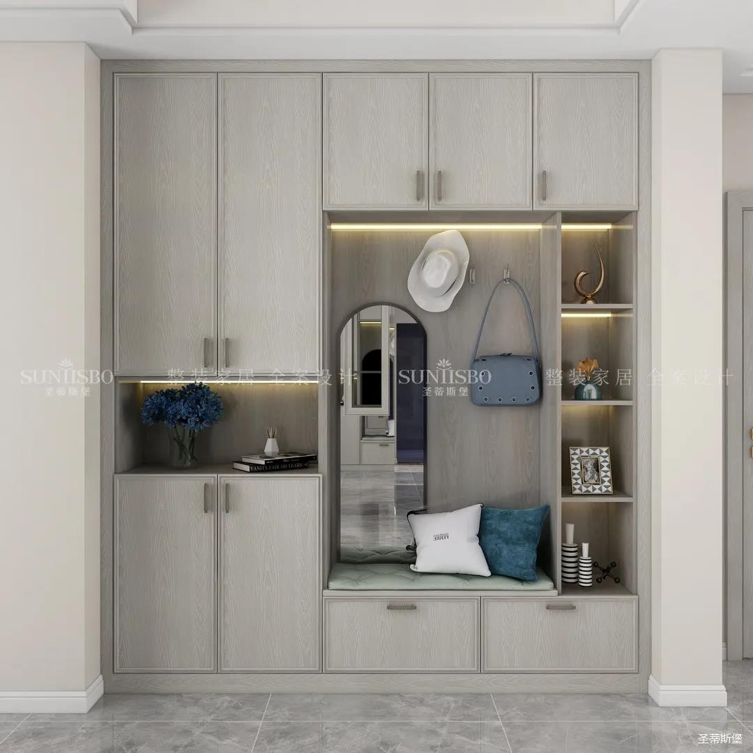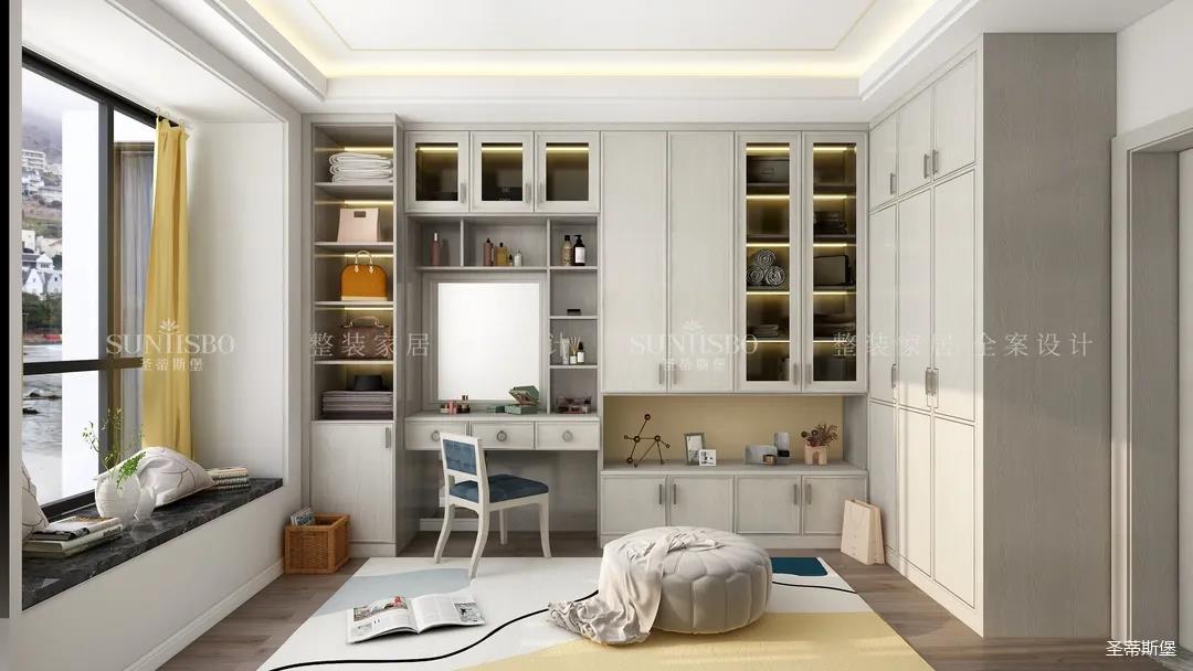 衣帽間是女主特別要求的,設(shè)計(jì)是將房間打造成衣帽間系統(tǒng),采用L型布局,壁掛式設(shè)計(jì),讓穿搭動(dòng)線更順暢,視覺上也更通透,可直觀的展示女主人穿搭品味。玻璃層板與背板花色的結(jié)合,精致靈動(dòng),成為時(shí)尚與輕奢的寫照,封閉區(qū)衣柜的合理格局規(guī)劃,完美詮釋現(xiàn)代輕奢風(fēng)于當(dāng)代定制中的前瞻性。
