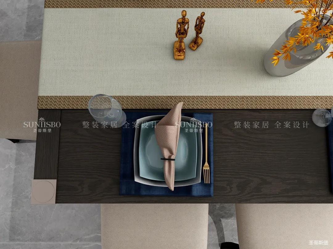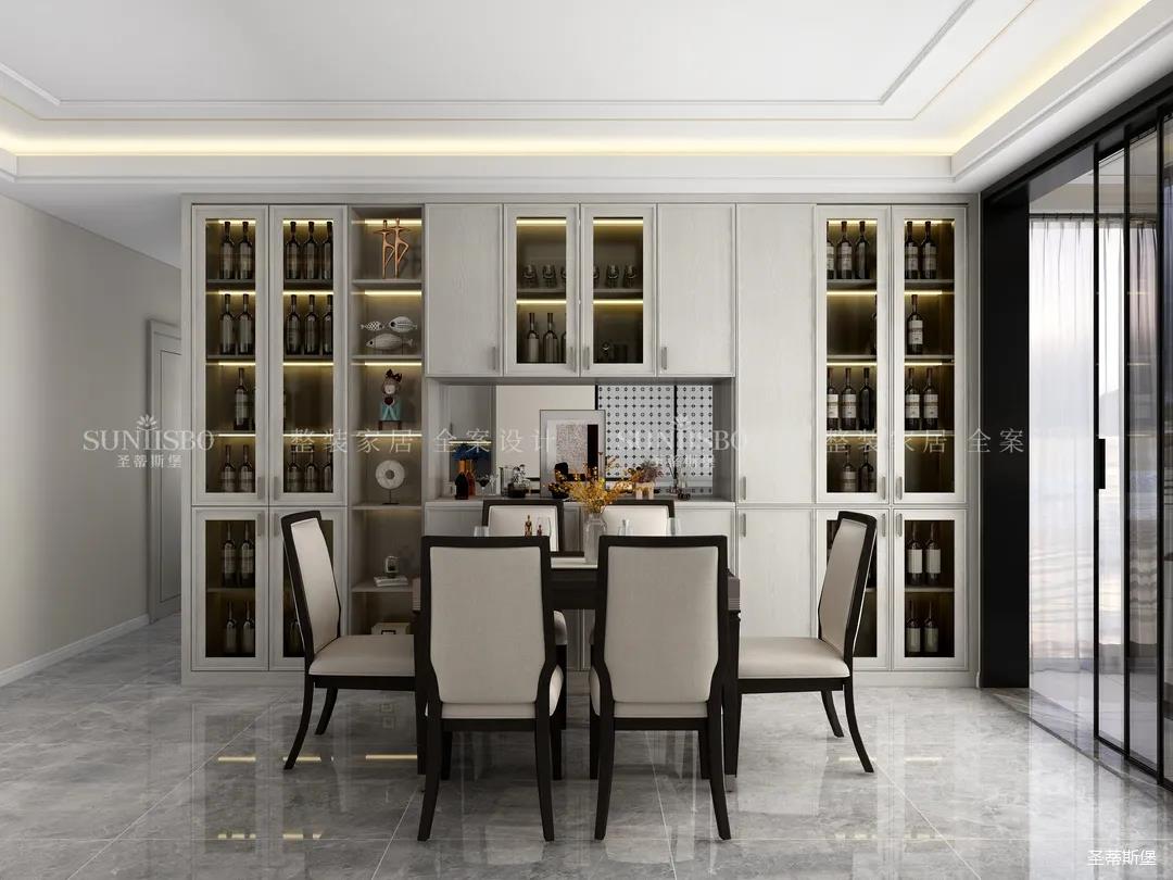 餐廳和客廳以大橫廳的形式展開,設(shè)計(jì)師將實(shí)木、玻璃、皮質(zhì)、金屬等看似相互排斥的元素相互重組,讓餐廳呈現(xiàn)多元式的輕奢氛圍。深淺色彩,對(duì)稱型的定制柜,都讓空間形成強(qiáng)有力的質(zhì)感對(duì)比。無論是午餐窗外的車水馬龍,還是晚宴的點(diǎn)點(diǎn)繁星,都能給屋主帶來良好的就餐體驗(yàn)。