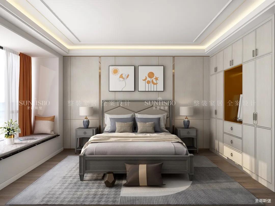 主臥隨著優(yōu)雅的金屬線條鋪開,臥室內(nèi)的靜謐感有序的傳遞著,帶有溫度的木飾面與溫潤(rùn)的實(shí)木地板在同一空間交匯,充滿輕奢質(zhì)感。明亮橙的色彩點(diǎn)綴讓空間活躍的格調(diào)不斷擴(kuò)充,仿古白的定制柜體在空間形成若隱若現(xiàn)的視覺平衡,將溫暖,柔和組合成日常的睡眠氛圍。