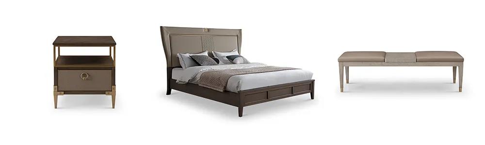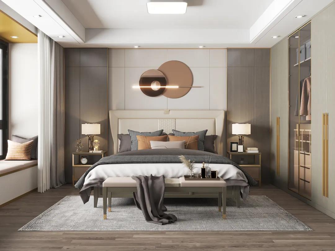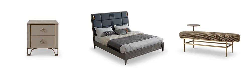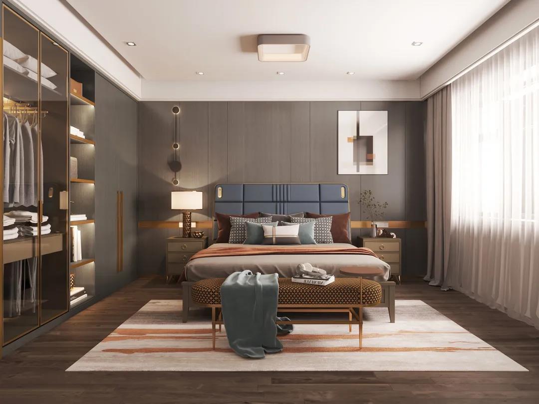 床屏時尚的霧霾藍色,與素雅的床品營造出一種低調的簡奢氛圍。金屬點綴著柜體拉手,床尾凳、床頭柜等微小細節(jié),讓生活充滿著內在涵養(yǎng)與力量。