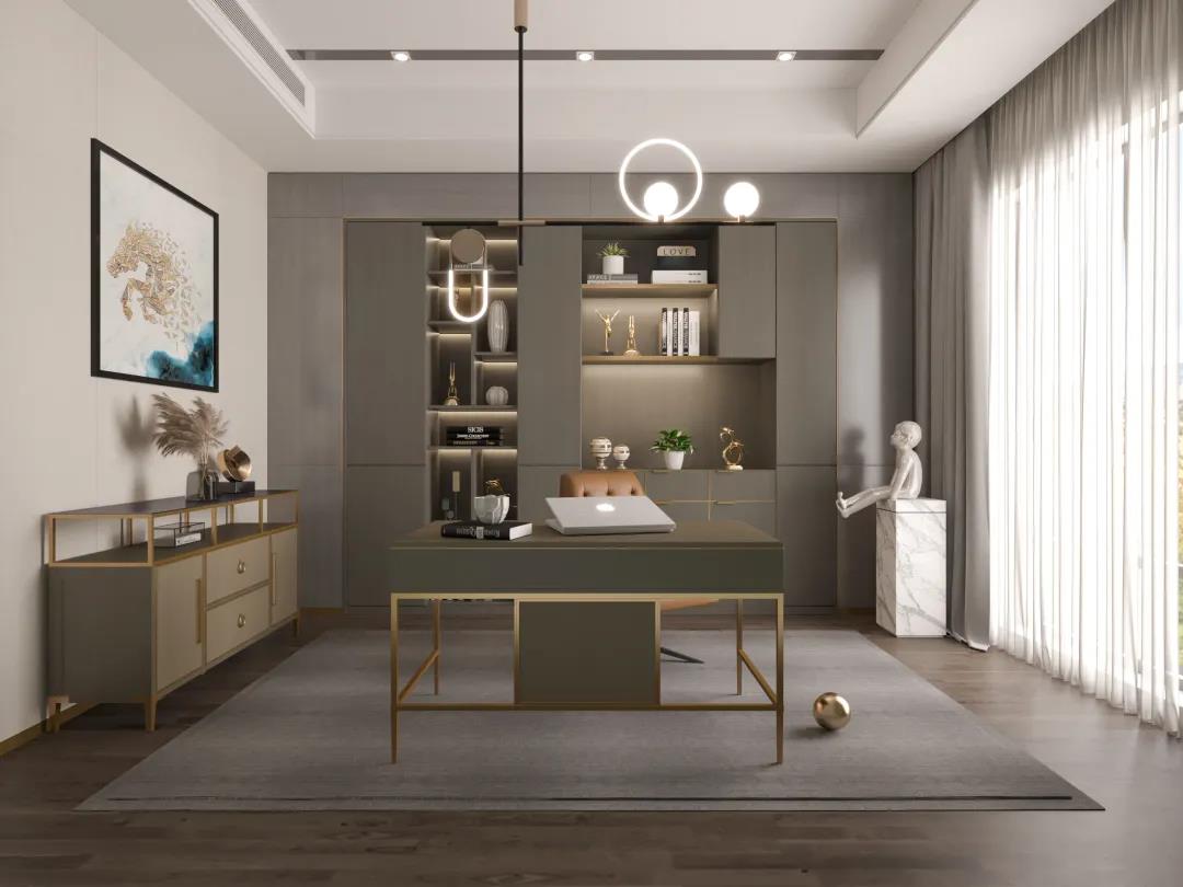 書房用現(xiàn)代手法定制了一個審美與意境并存的閱讀空間,極具生活儀式感。整體嵌入式書柜,用淺灰打底,深灰為框架,讓身心閱讀片刻沉浸。